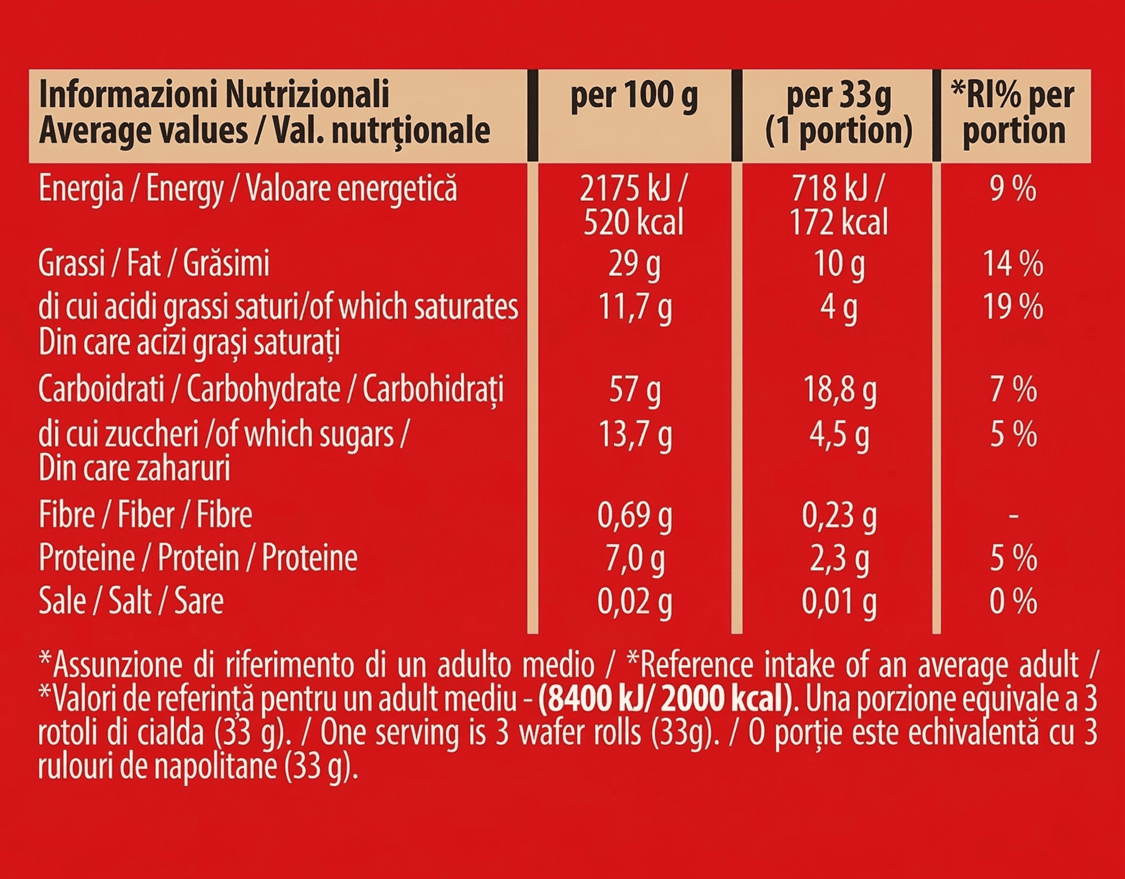 Questi deliziosi wafer croccanti racchiudono un ricco ripieno alla crema di vaniglia (60%), offrendo un’esperienza di gusto equilibrata tra leggerezza e cremosità.